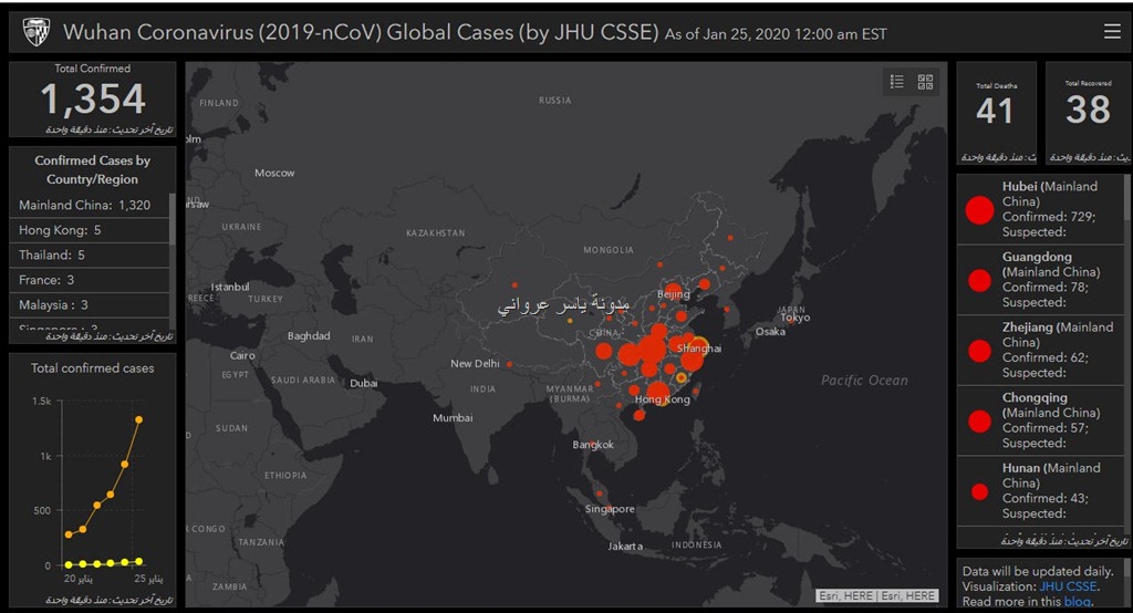 خريطة تفاعلية بأماكن الإصابات بفيروس كورونا المستجد حول العالم ، وهي عبارة عن لوحة معلومات تتبع الحالات التي تم الإبلاغ عنها بشكل يومي.