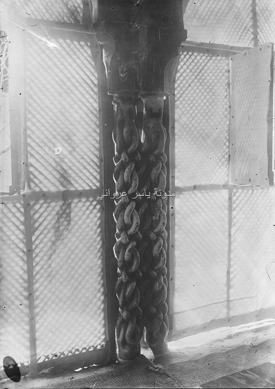 عامود رخامي مزدوج بين النافذتين الجنوبيتين تتشابك أربع افاعي تُشكل بالتفافها تضفيرة جميلة