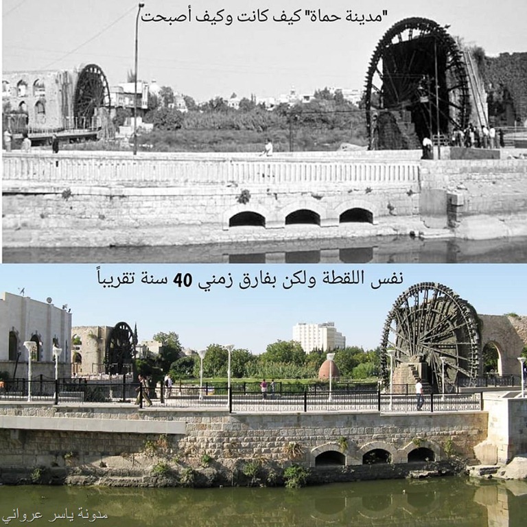 نلاحظ ان الشكل العام للنواعير والجسر لم يتغير كثيراً فقط سور الجسر كان من الحجر وأصبح من الحديد .