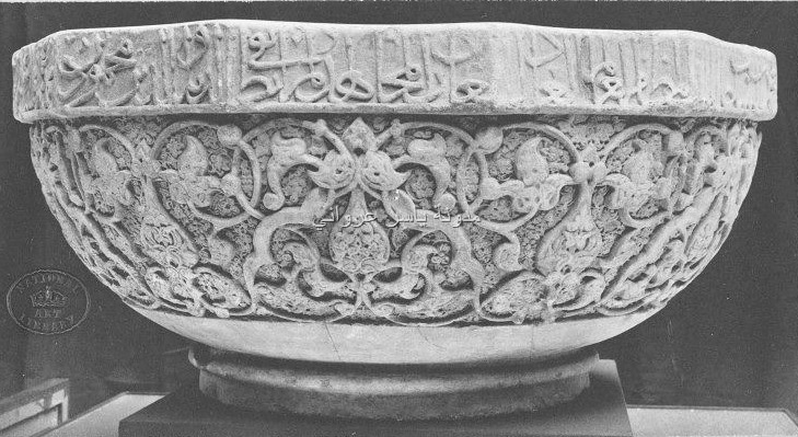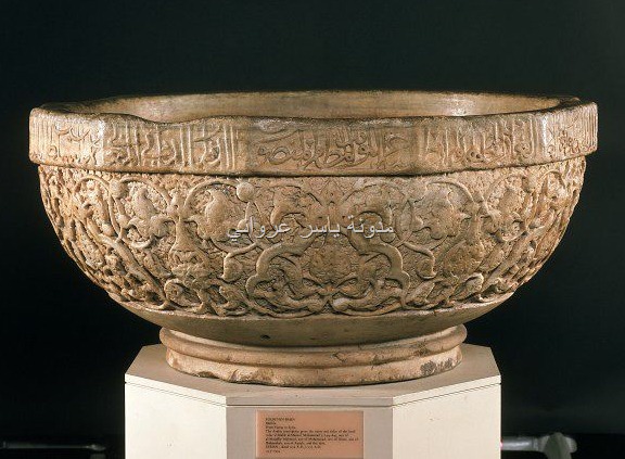 صُنع الجرن من الرخام المنحوت سنة ( 676هـ – 1277م ) في مدينة حماة .